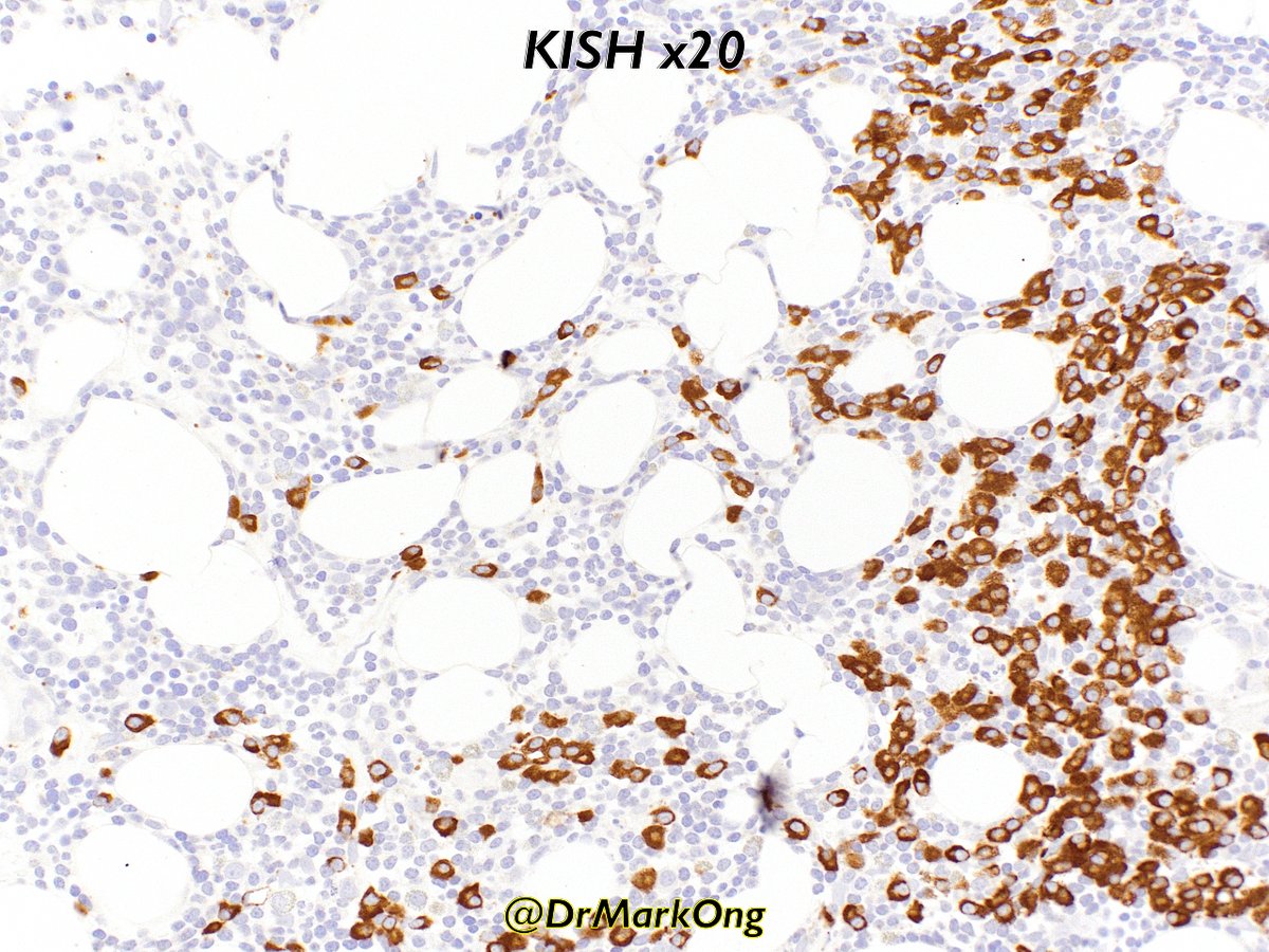CD79a highlights both lymphoid & plasmacytic components. Note IgM kappa restriction (ISH = in situ hybridisation).