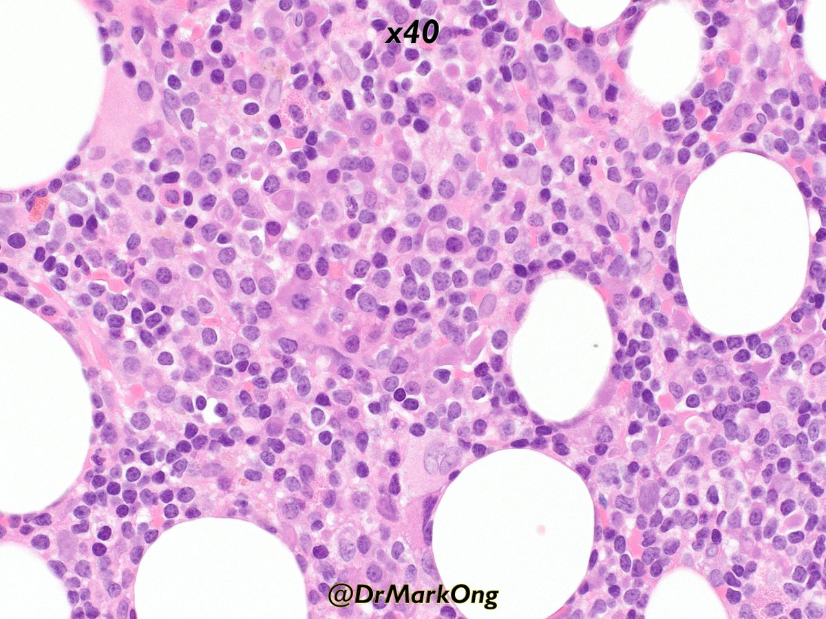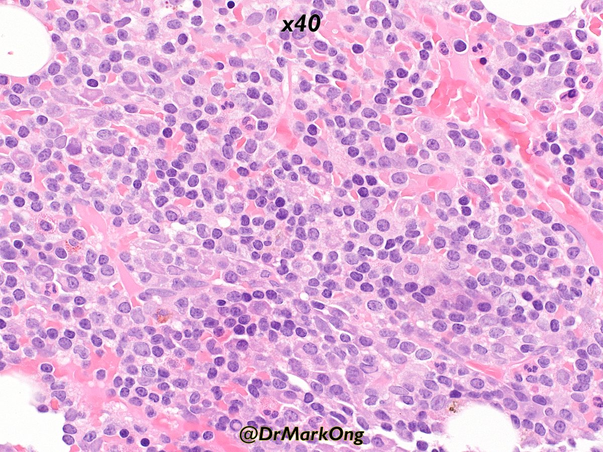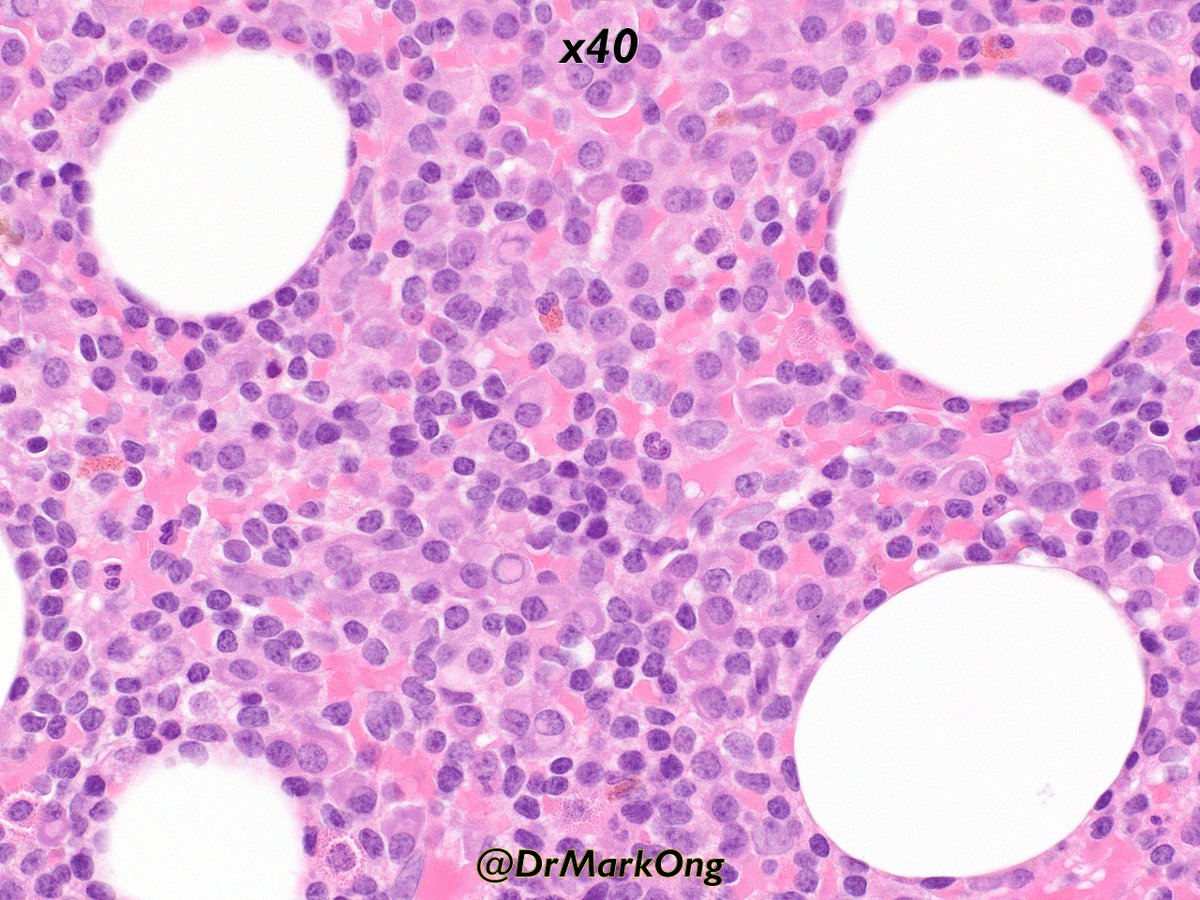 Here is the bone marrow trephine. Note a mix of plasma cells (with paranuclear hofs & occasional Dutcher bodies), but also some lymphoid cells.