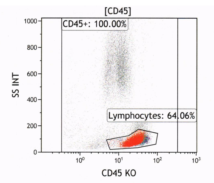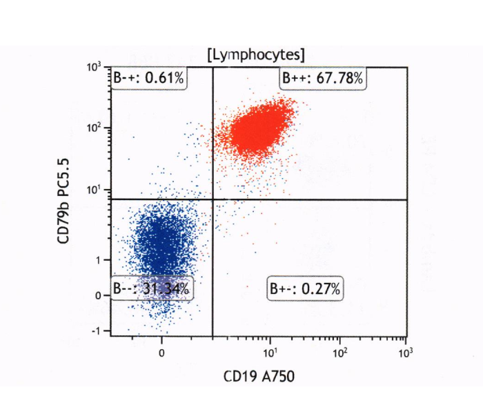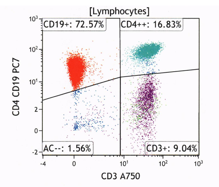 This plot is a bit confusing as both CD4 & CD19 use the same fluorescent tag. Right half of plot are CD3+ T-cells, divided into CD4+ (top right, cyan) and CD4-(bottom right, maroon).
