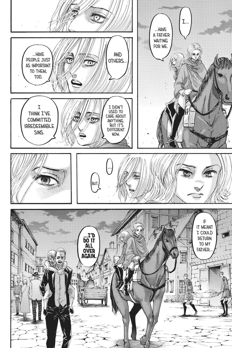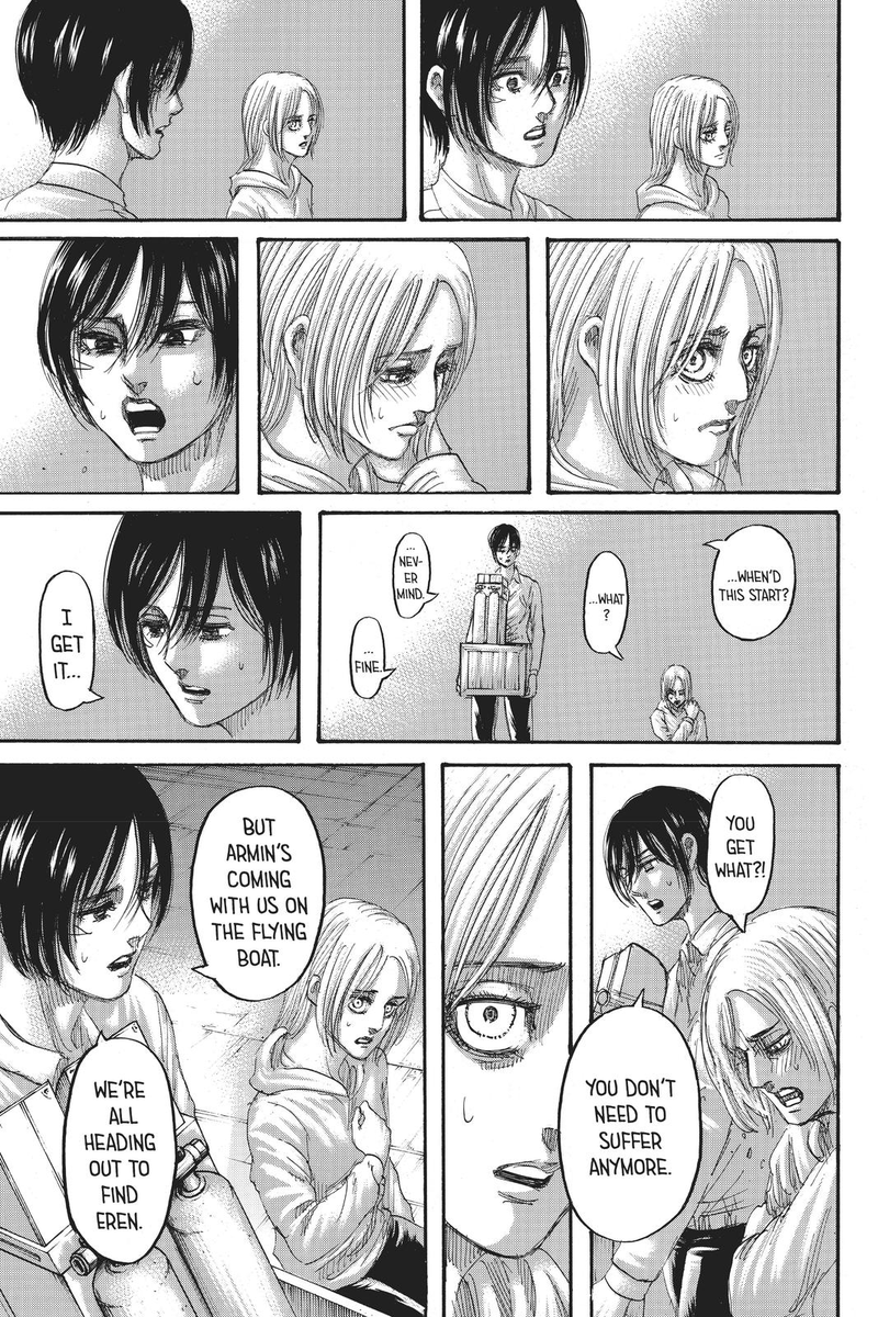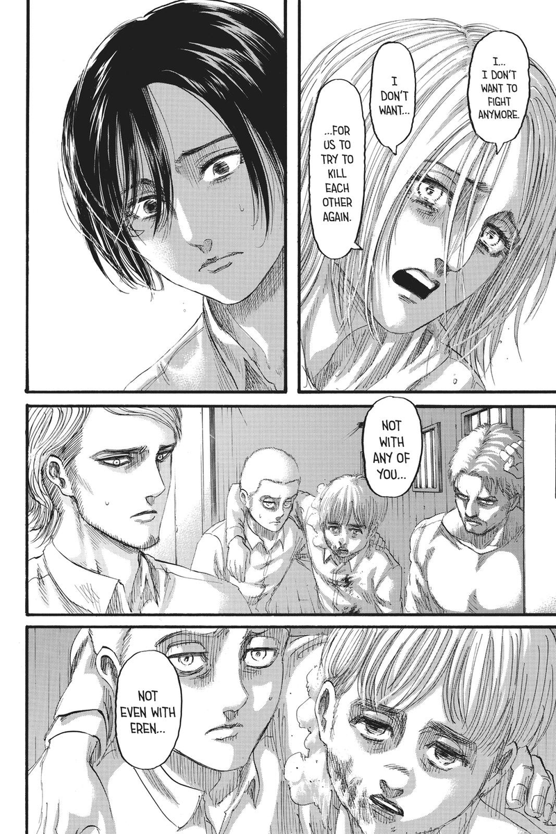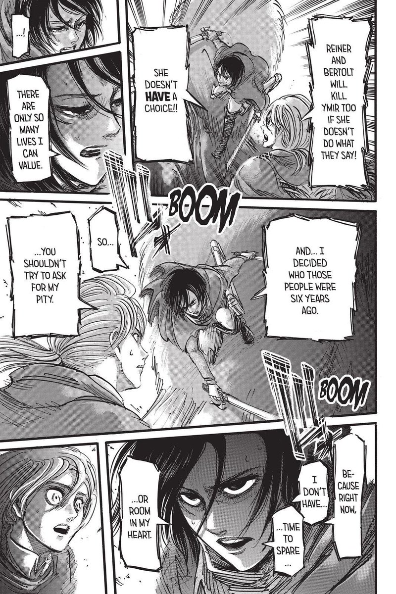 To be clear, she’s compassionate, she’s always cared, but she repressed or wouldn’t allow herself to act on that care because of her trauma and concern that she needs to prioritize Eren (and Armin), she has to protect them to not lose them.