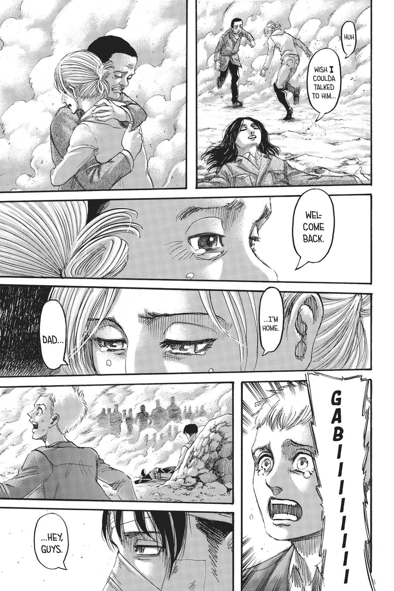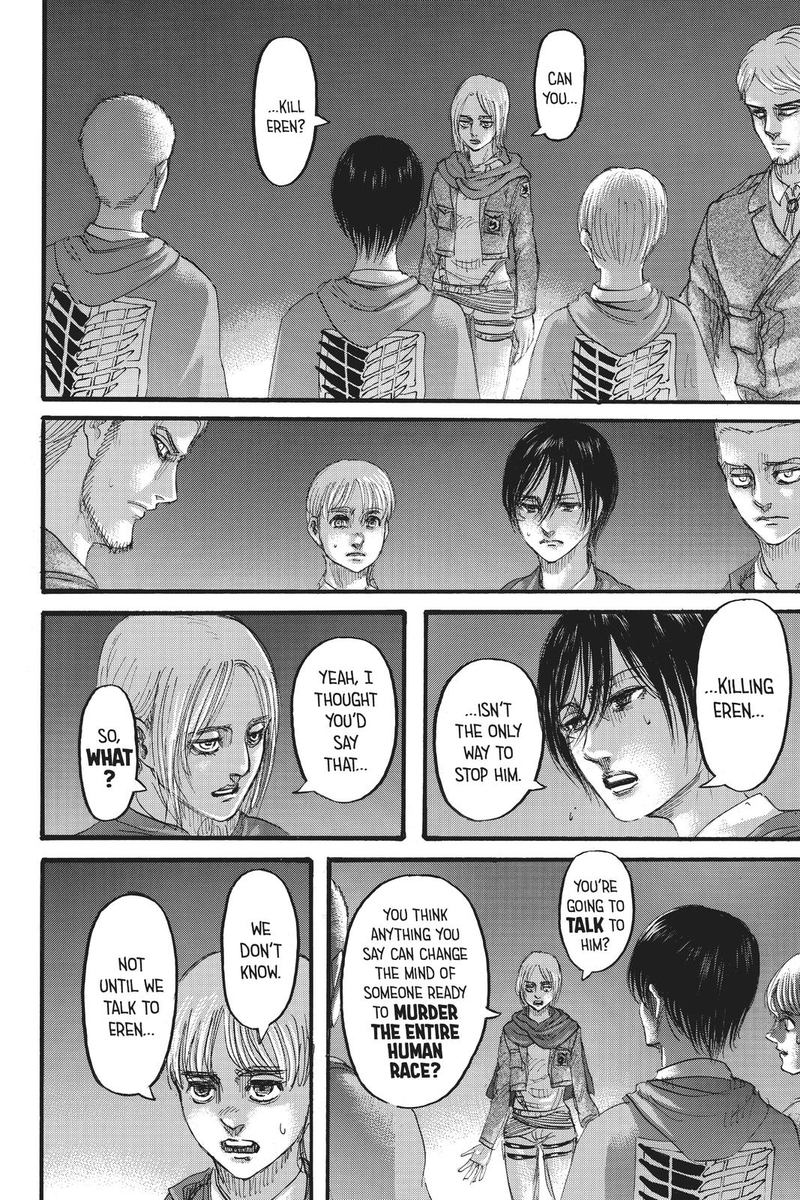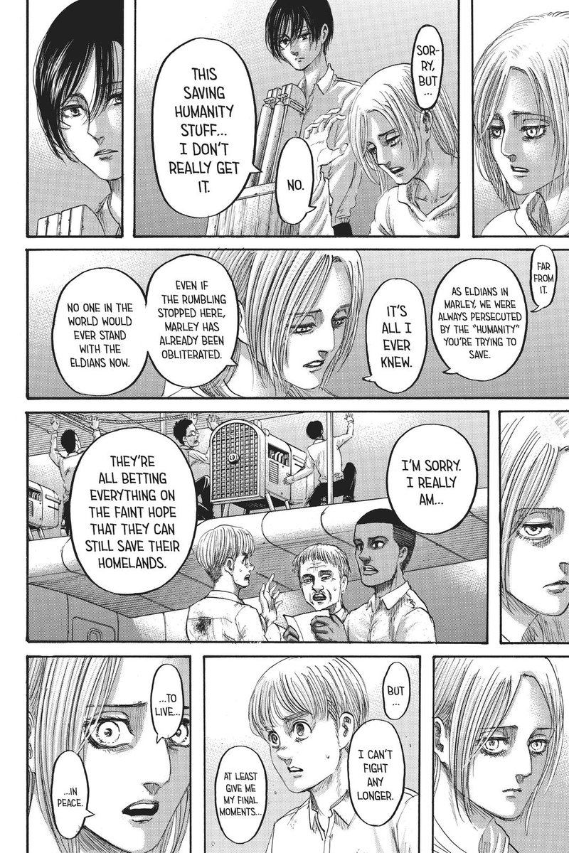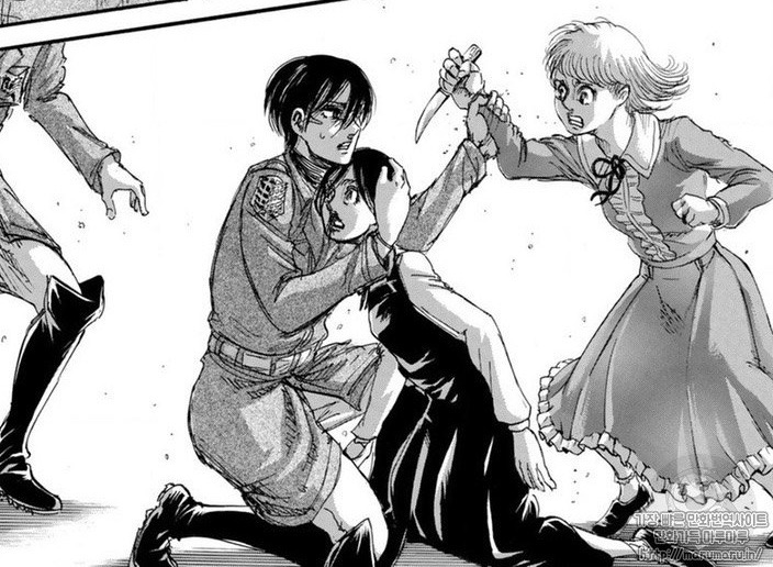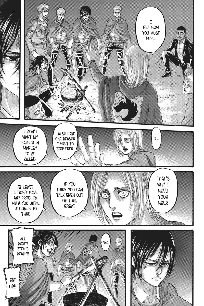 To be clear, she’s compassionate, she’s always cared, but she repressed or wouldn’t allow herself to act on that care because of her trauma and concern that she needs to prioritize Eren (and Armin), she has to protect them to not lose them.