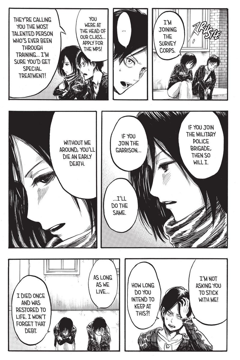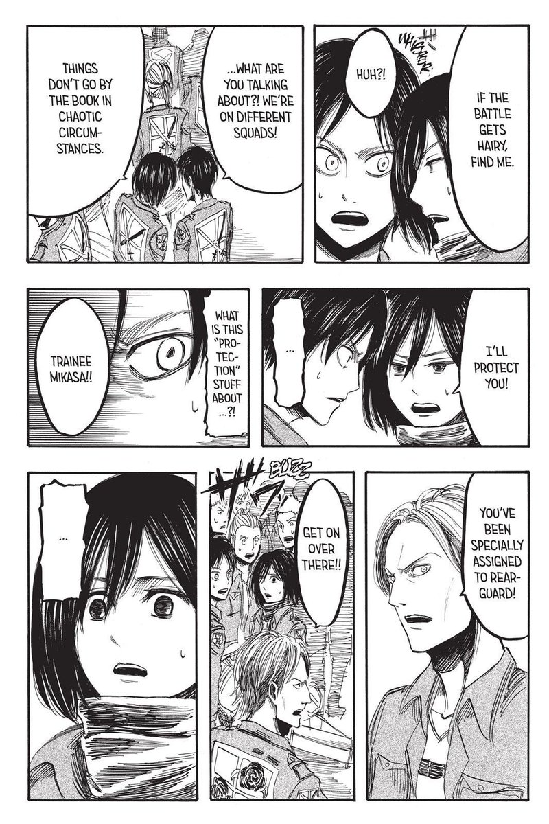 Originally, Mikasa’s very set on her priorities: she wants to protect Eren, the last of her family, & can’t afford for others to take precedence; she viewed other priorities as at odds with her goal so she believes she can’t afford to let other people & priorities in