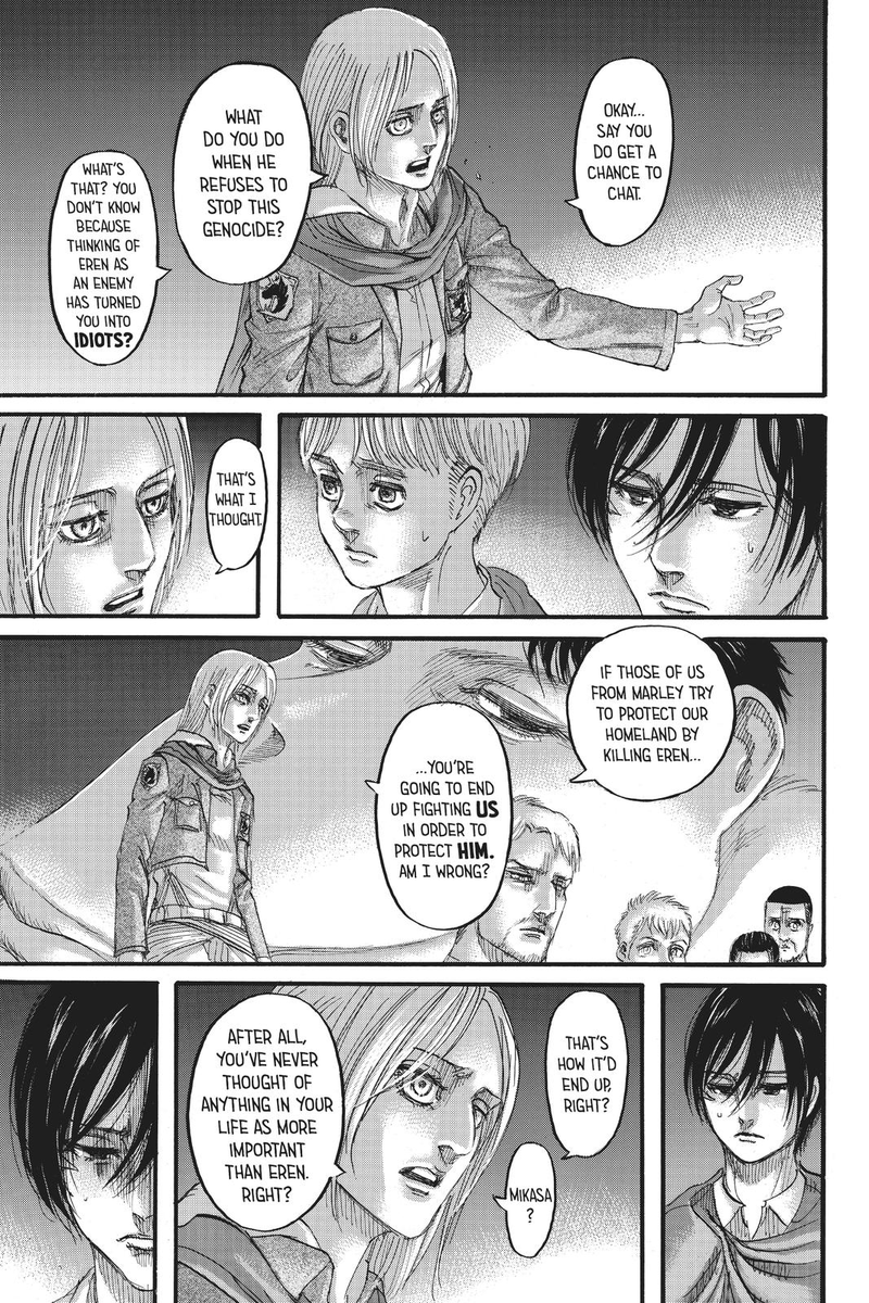 So it’s explicitly Annie who questions if Mikasa can kill Eren but also says she understands.