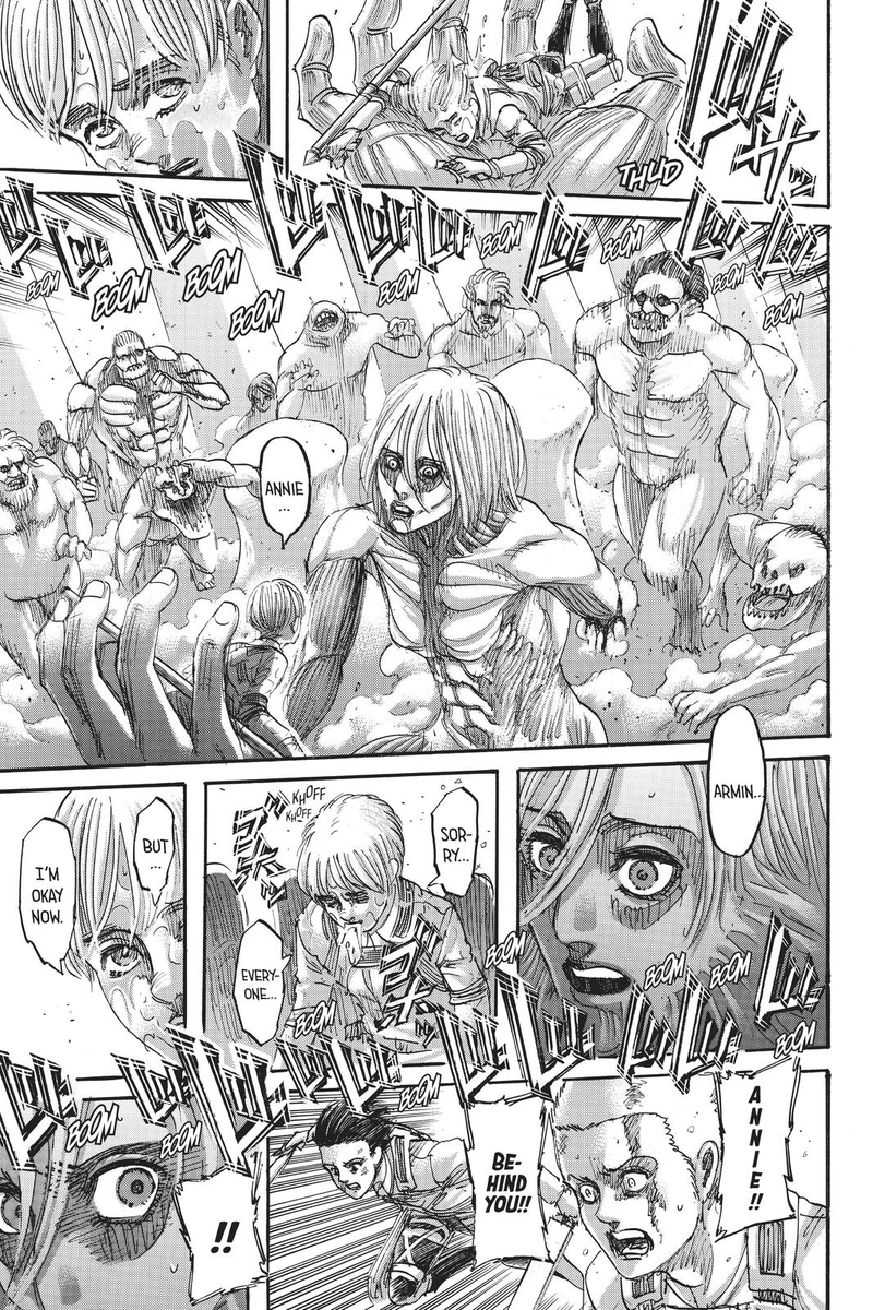 Mikasa fighting Annie yelling “Give [Eren] back” after abandoning her squad to chase Eren vs. yelling “Give Armin back” as she partners with Annie (& co.) to save Armin while they oppose Eren’s actions together highlight the ways things have changed for them since the beginning